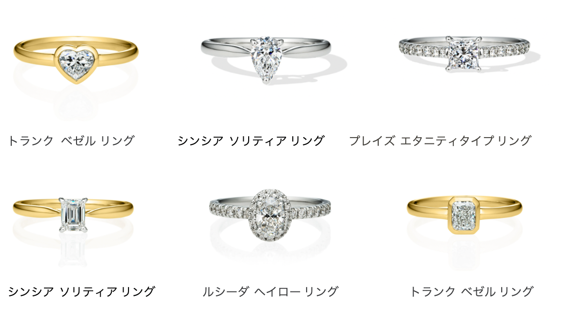 さらに、ダイヤモンドのシェイプだけでなく、デザインもこだわりたいという方のお声に応え、対応リングデザインを通常の4種類から10種類へと拡充します。お好きなリングデザインと合わせて完成後のリングをイメージしていただきながら、その場でオーダーが可能です。